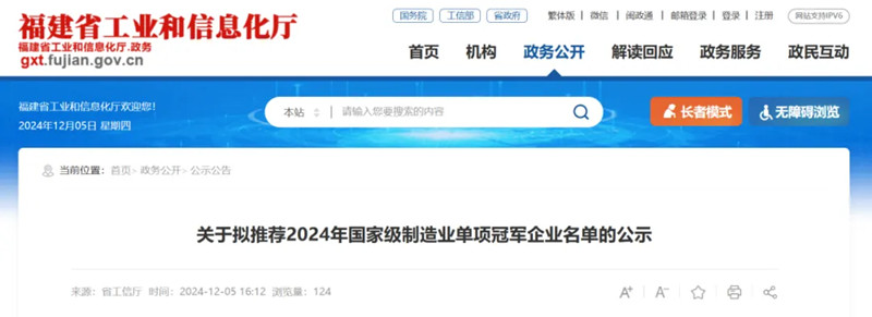 近日,福建省工信厅网站发布公示拟推荐25家企业为“2024年国家级制造业单项冠军企业来看详情——