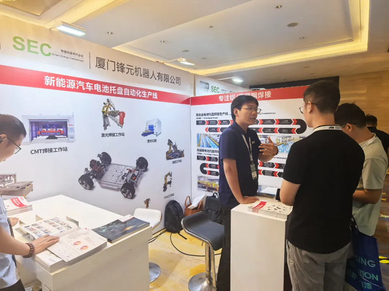 在锋元展台,两大核心 ——高强钢电池托盘自动化产线与铝合金电池托盘焊接系统吸引了众多嘉宾驻足。作为新能源汽车安全与轻量化的关键部件,电池托盘的焊接精度直接影响整车性能,锋元通过攻克铝材、高强钢焊接工艺难题,实现了焊接缺陷率低于 1% 的行业突破。锋元现场负责人介绍:“铝合金电池托盘焊接产线整合了从原材料预处理到成品检测的全环节工艺,可实现单日 800套电池托盘的柔性生产,已服务超100家新能源汽车配件核心客户。”