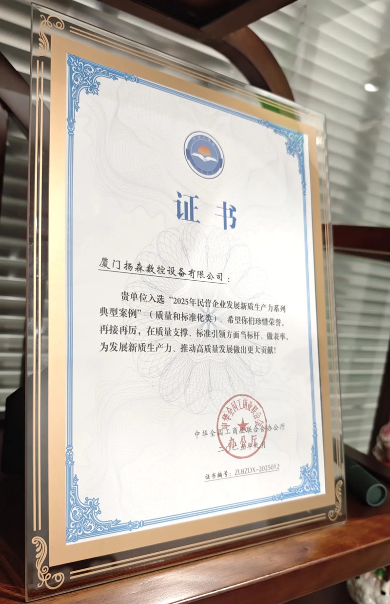 近日,中华全国工商业联合会办公厅正式发布通知,厦门扬森数控设备有限公司凭借其在质量和标准化领域的专业实践,成功入选“2025年民营企业发展新质生产力系列典型案例”(质量和标准化类),为行业树立了以质量铸就新质生产力的新标杆。
